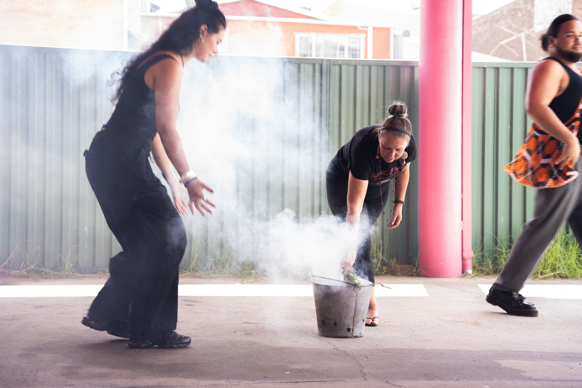 Two people stand near a metal bucket producing smoke, with one person bending over the bucket and another standing beside, outdoors under a covered area.