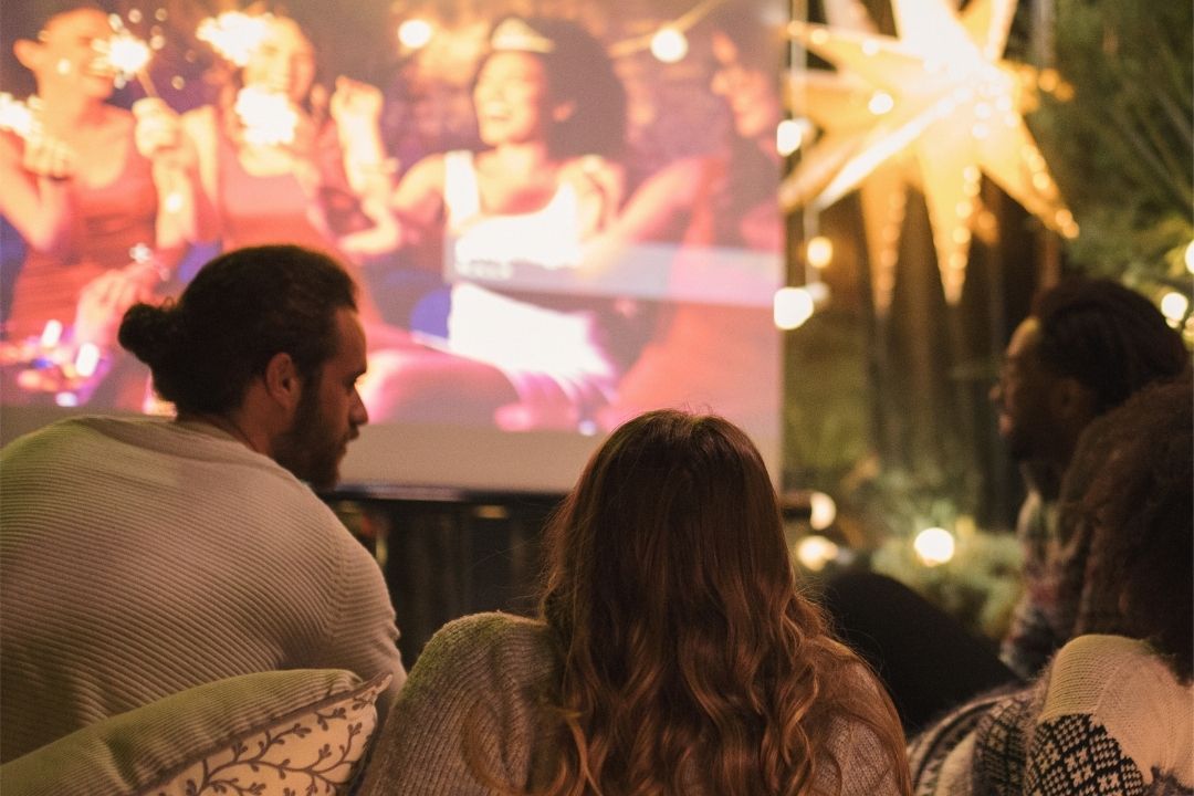 A group of people viewed from behind watch a vibrant outdoor movie screening. Warm lighting and a star-shaped lantern create a cozy, festive atmosphere.
