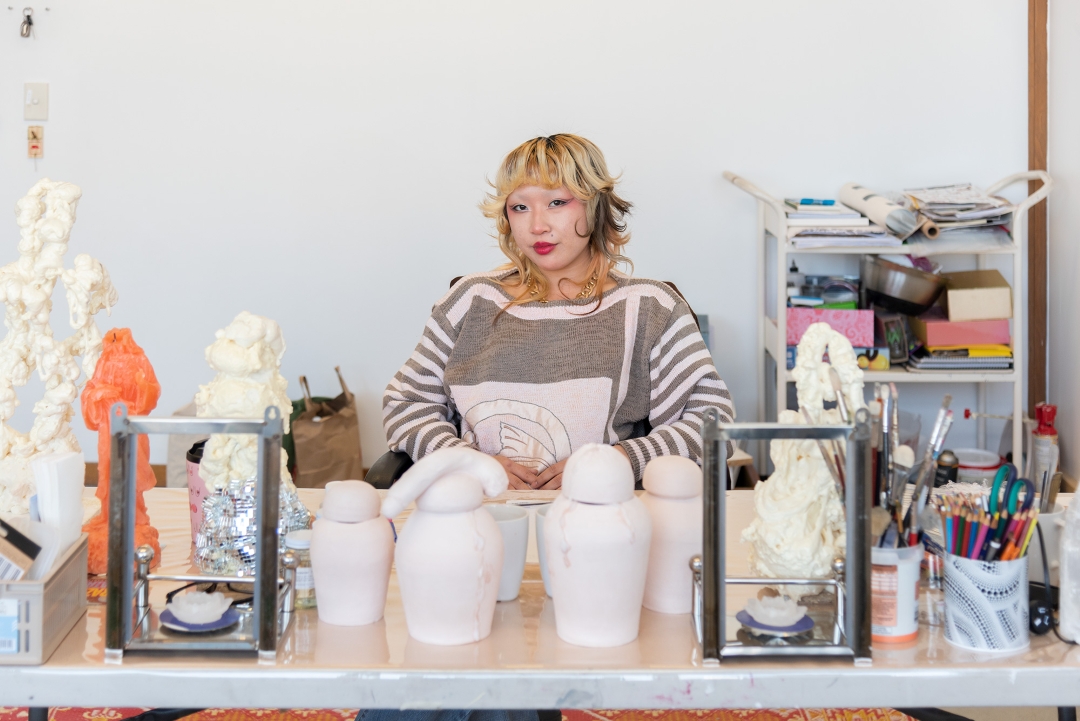 Artist seated at a cluttered desk with sculptures, surrounded by art supplies. The scene conveys creativity and focus in a studio setting.