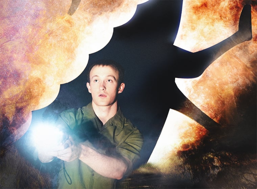A person in a green shirt stands alert, shining a bright light forward. They are in front of a fiery explosion and a large, dark silhouette looms behind them.